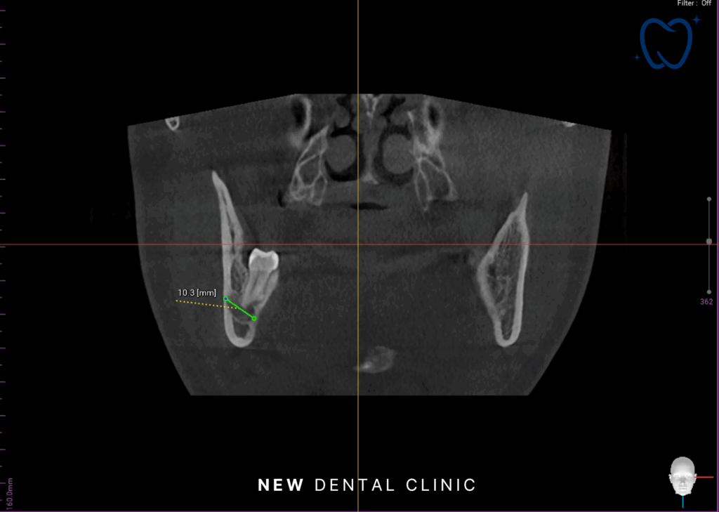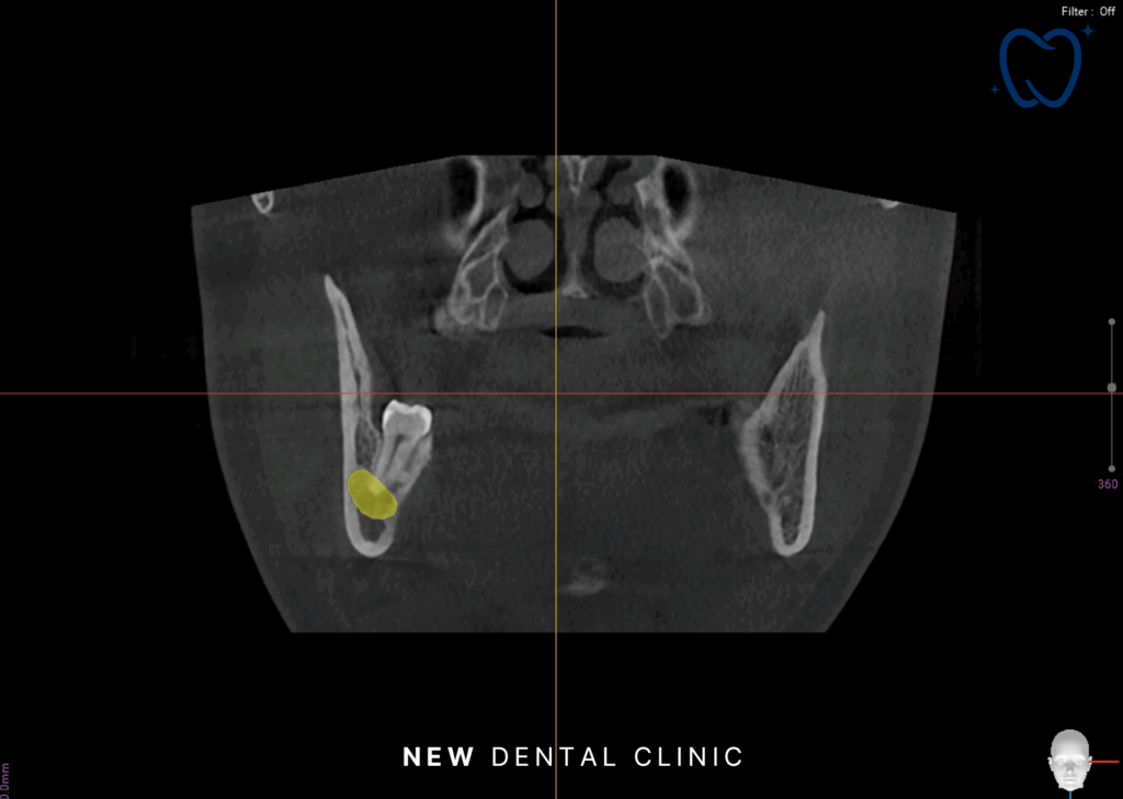 CT 촬영 결과 뿌리 주변에 큰 물혹이 형성되어 있는 것을 볼 수 있었습니다. 영상 속 노랗게 표시된 부분이 물혹인데요. 크기를 측정해 보니 10mm 정도 되는 것으로 파악되었습니다. 물혹은 볼 쪽의 잇몸뼈를 매우 얇게 만들었을 정도로 커져 있었습니다. 이대로 좀 더 진행되었다가는 아래턱뼈가 부러지는 상황도 발생할 수 있었는데요. 문제를 해결하기 위해서는 물혹과 함께 물혹의 원인이 되는 제3대구치를 빼야 합니다. 🦷