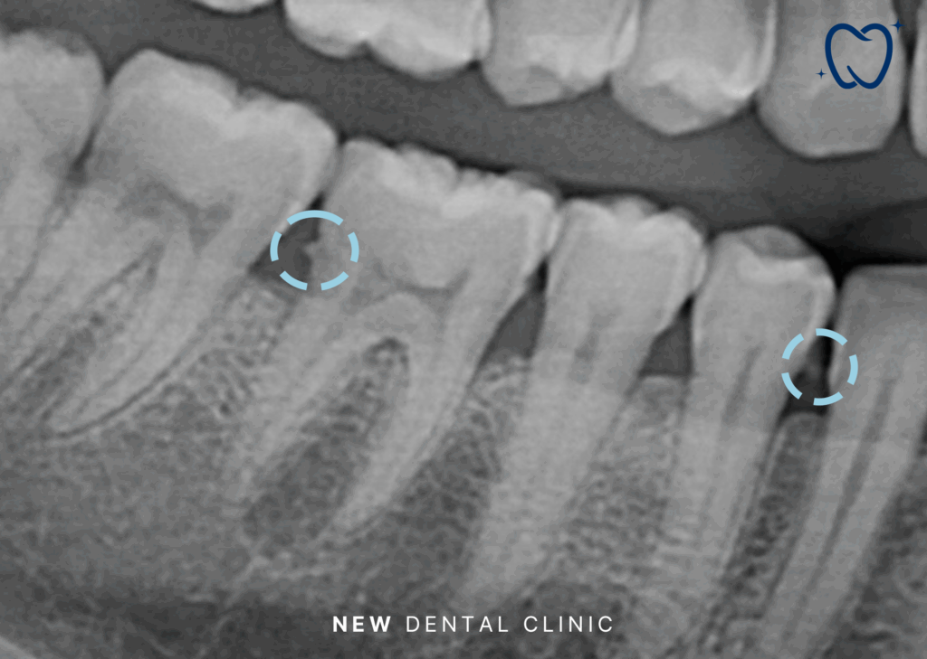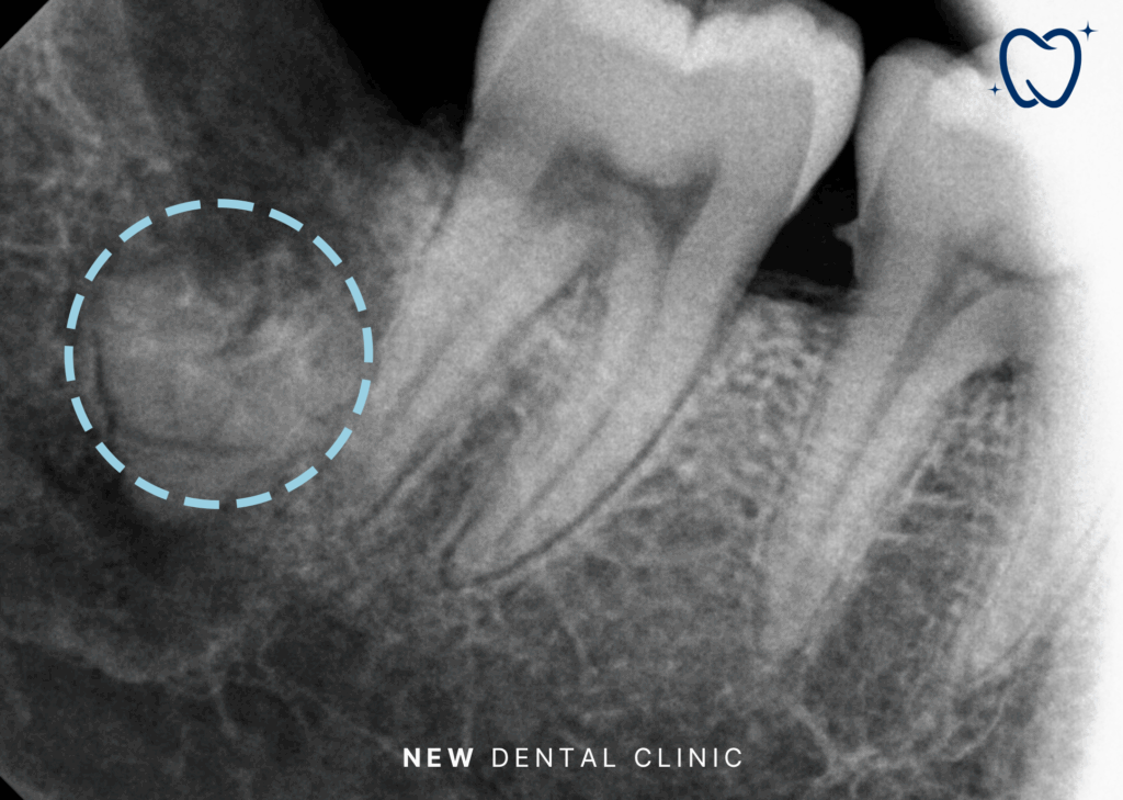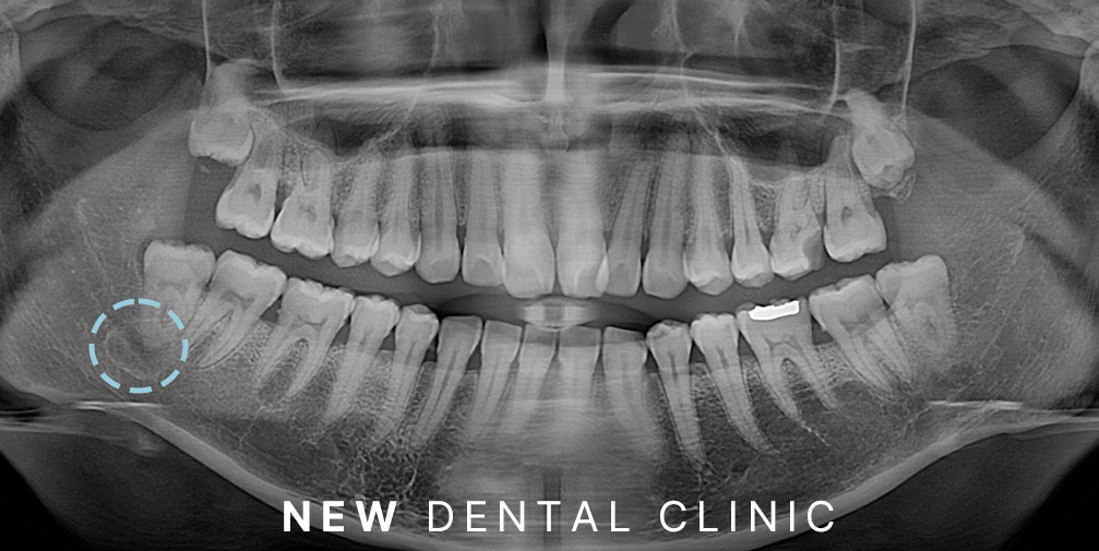 위 엑스레이는 제3대구치를 체크하기 위해 촬영했던 영상을 확대한 것입니다. 하늘색 원으로 표시한 부분을 보시면 치아의 머리와 뿌리가 이어지는 부위가 매끄럽지 않고 볼록볼록 튀어나와 있는 것이 보이실 텐데요. 이는 바로 잇몸 속에 존재하는 치석 덩어리 입니다.