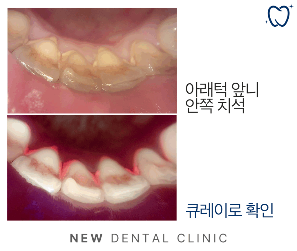 치석은 육안으로도 확인해 볼 수 있었습니다. 입 안에서 치석이 가장 쉽게 쌓이는 아래턱 안쪽 사진을 보시면 되는데요. 언뜻 보기에는 잘 느끼지 못하실 수 있지만 새로운치과에서 사용하는 큐레이(Q-ray) 장비의 빛을 쐬어보니 빨간 형광빛으로 치석이 보입니다. 큐레이를 통해서는 치석 및 치태 뿐만 아니라 관찰하기 어려운 충치나 치아 균열선도 확인해 볼 수 있습니다. 😃
