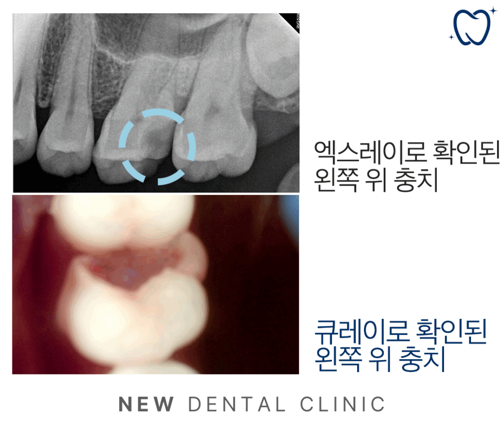 큐레이를 통해 구강 검진 시 발견된 왼쪽 위 첫 번째 큰 어금니에 생긴 충치도 확인해 보았습니다. 자세히 볼 수 있는 엑스레이 촬영 결과 충치가 신경까지 도달했을 만큼 이미 깊게 진행된 것을 볼 수 있었는데요. 해당 부분은 제3대구치로 인한 문제를 먼저 해결한 후에 치료를 시작하기로 했습니다.