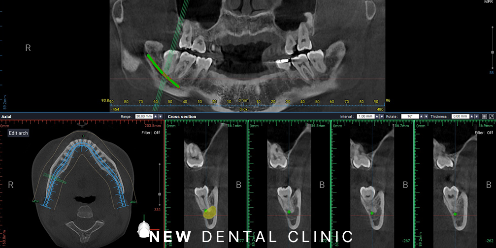 하지만 발치 역시 꽤 고난도 케이스에 속해있었습니다. 3D CT 영상을 통해 치아의 뿌리가 아래턱을 지나는 하치조신경과 맞닿아 있는 것으로 체크되었기 때문인데요. 연두색으로 표시된 부분이 CT 영상에서 하지조신경을 표시한 것 입니다.
