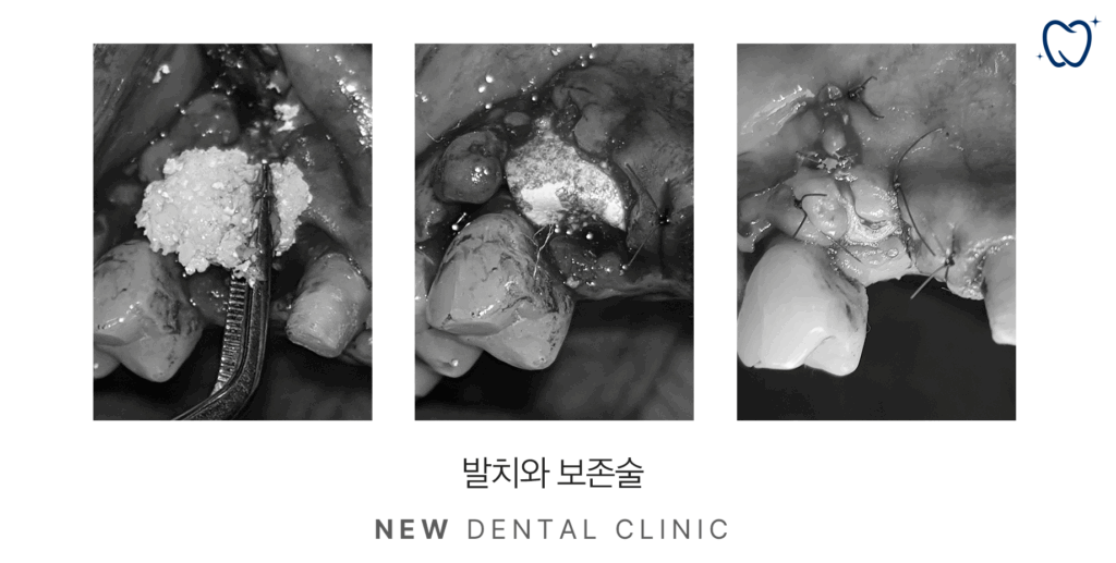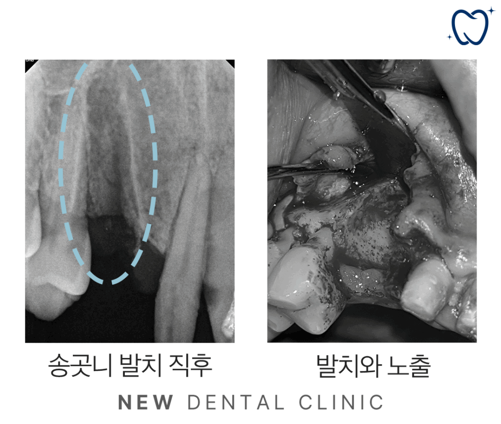 이후 송곳니 발치를 시행했습니다. 발치 후 해당 부분을 확인해 본 결과 원래부터 볼 쪽 잇몸뼈가 많이 손상되어 있는 상태였기 때문에 잇몸이 안쪽을 향해 움푹 꺼져버린 것으로 관찰 되었는데요. 이 상태에서 잇몸뼈의 흡수가 진행된다면 만.족스러운 예후를 기대할 수 없었으므로 발치와 보존술을 진행하기로 했습니다.