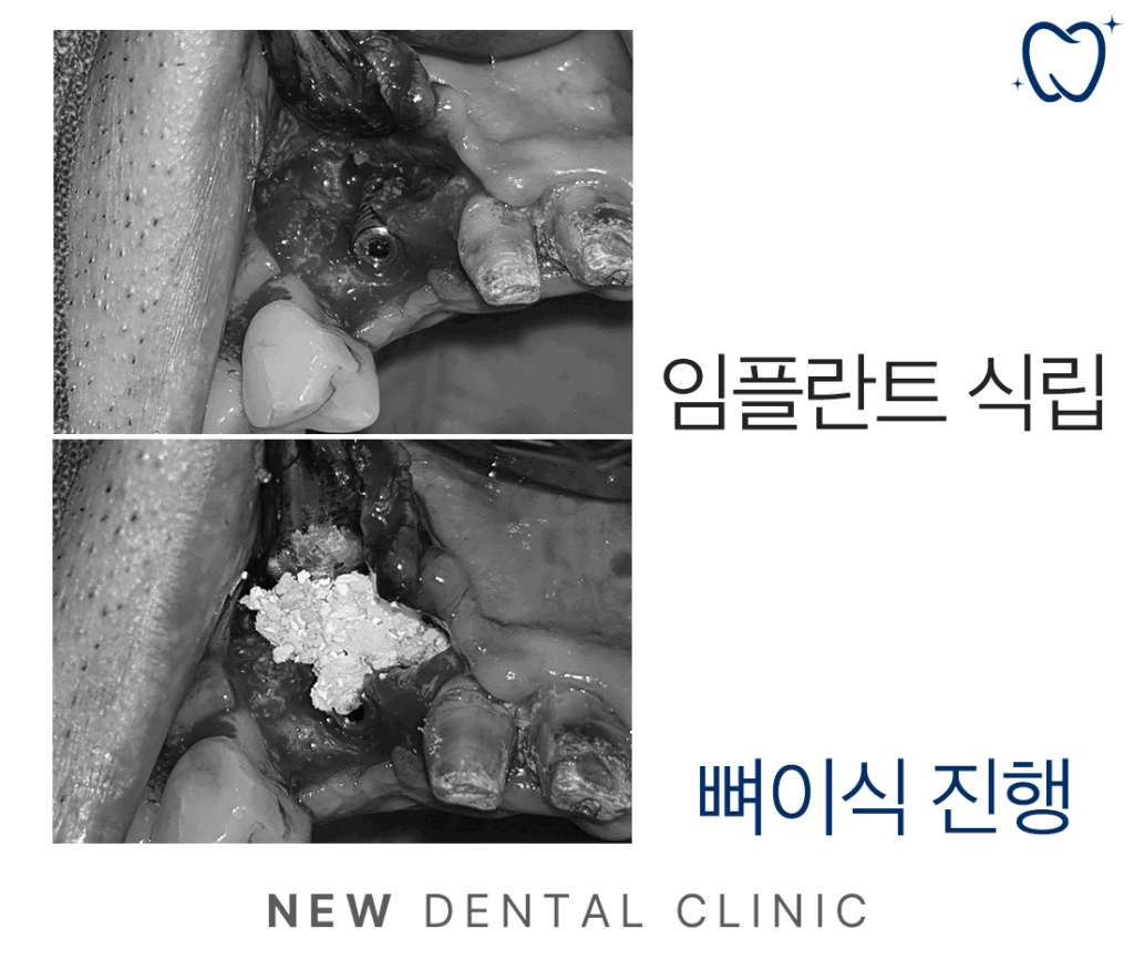 정밀 검사 결과를 바탕으로 수술을 시작했습니다. 하지만 식립을 위해 잇몸 절개 후 뼈를 드러낸 결과 4개월 전에 진행한 발치와 보존술을 통해 이식한 뼈가 충분히 단단해지지 않은 것으로 확인되었는데요. 따라서 제대로 굳지 않은 부분은 모두 제거하였으며, 임플란트 인공치근을 계획된 위치에 심은 후에 다시 인공 치근 주변에 뼈이식을 시행했습니다.