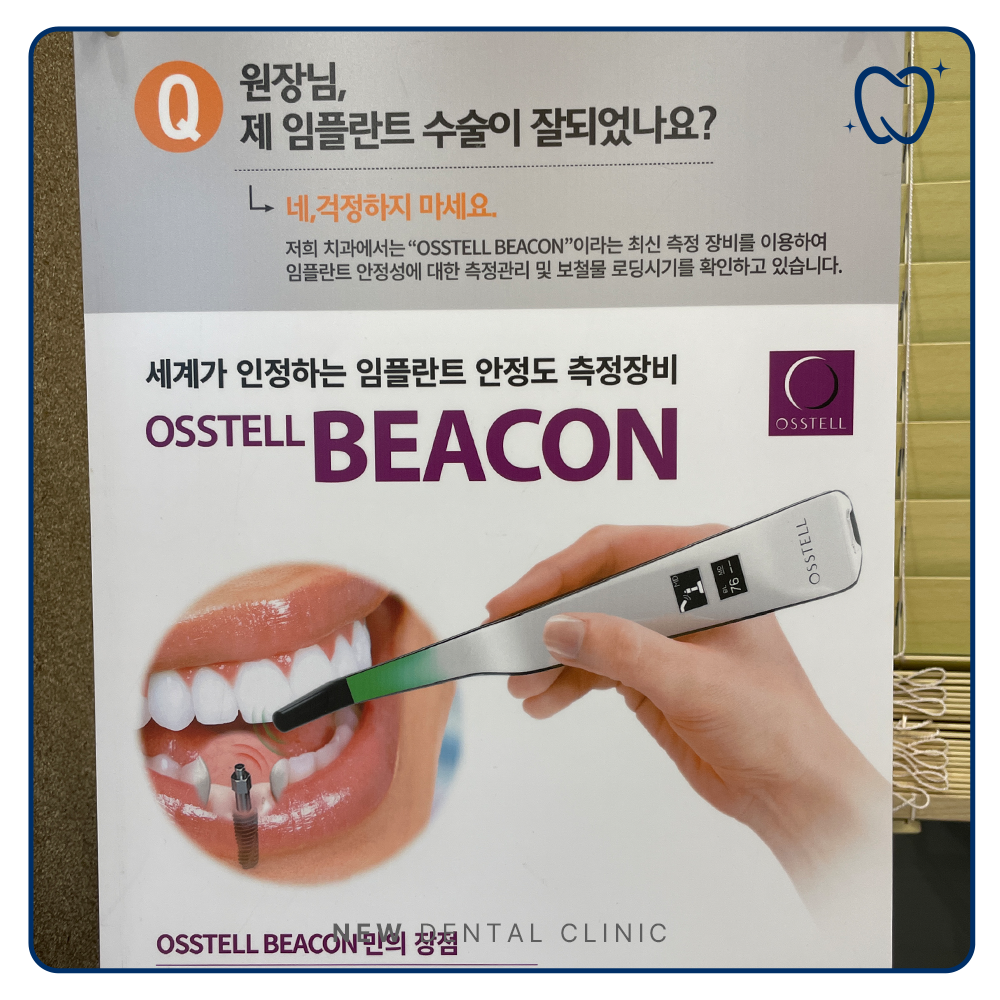 이와 달리 앞니보철을 잘하는 정왕동치과에서는 원내에 구비되어 있는 전용 임플란트 동요도 측정 장비인 ‘OSSTELL Beacon’을 활용하여 임플란트의 고정도를 객관적인 ISQ(Implant Stability Quotient) 수치로 체크하고 있습니다. 이는 측정 후 3가지 LED 색상(빨강 낮음/노랑 보통/초록 높음)으로 골융합 상태를 보여주기 때문에 직관적으로 임플란트 골유착 상태를 확인 할 수 있습니다. ❤‍🔥