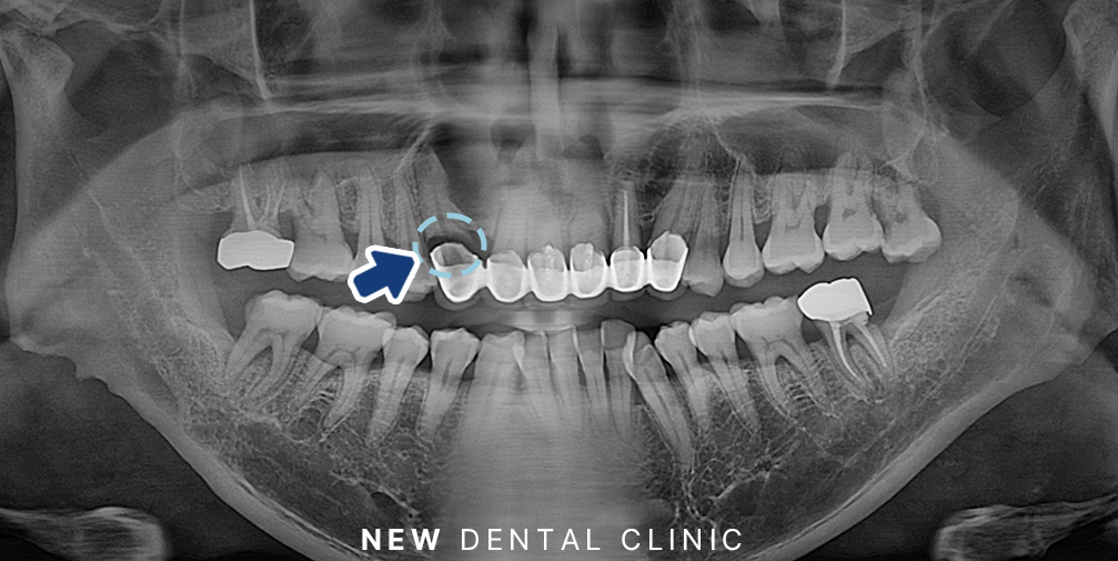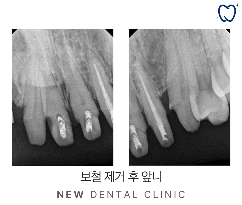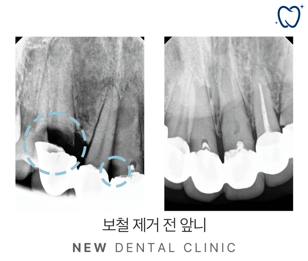 하늘색 원으로 표시한 부분을 보시면 됩니다. 뿌리와 보철물 사이로 까만 공간이 크게 있는 것이 확인할 수 있었는데요. 이는 충치로 인해 발생한 상황이며, 송곳니 뿐만 아니라 함께 보철물로 연결되어 있는 다른 앞니에도 조금씩 충치가 있는 것을 볼 수 있었습니다. 🦷