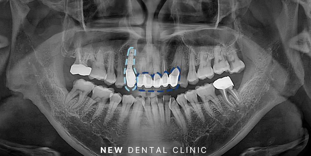 보철물 내부에 남아있는 치아 조직에 충치가 생긴 것이 확인되었기 때문에 보철물을 제거하고, 새롭게 치료를 하기로 했습니다. 6개의 앞니 중 가장 충치가 심했던 오른쪽 위의 송곳니는 뿌리만 남아있을 것으로 예상되었으므로 발치가 불가피했는데요. 따라서 송곳니는 발치 후 임플란트로 대신하기로 했으며, 남은 5개의 치아는 충치에 의해 손상된 부분을 제거 및 재료 보강 후에 다시 브릿지로 씌우기로 했습니다.