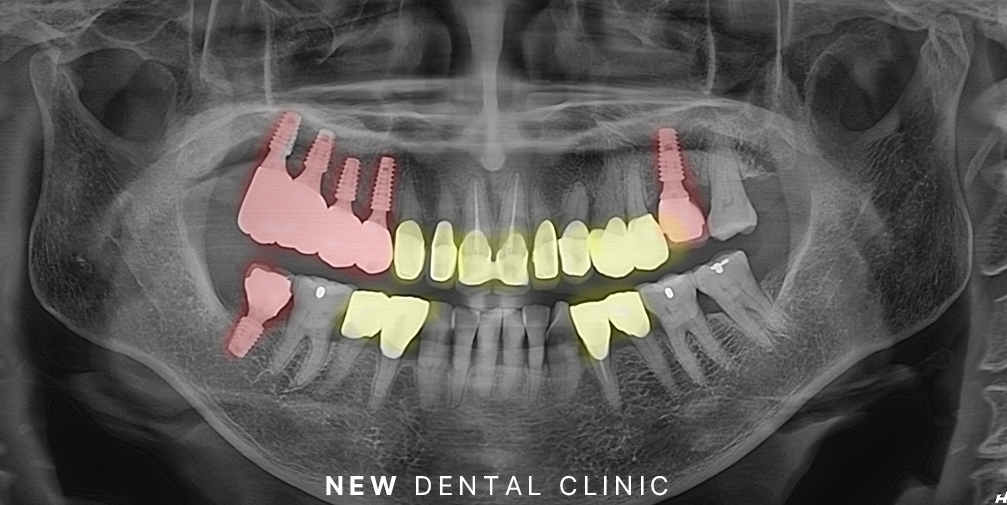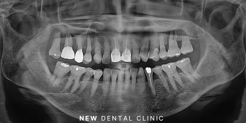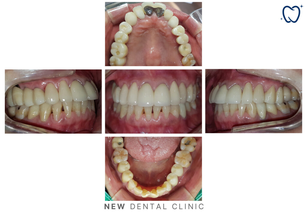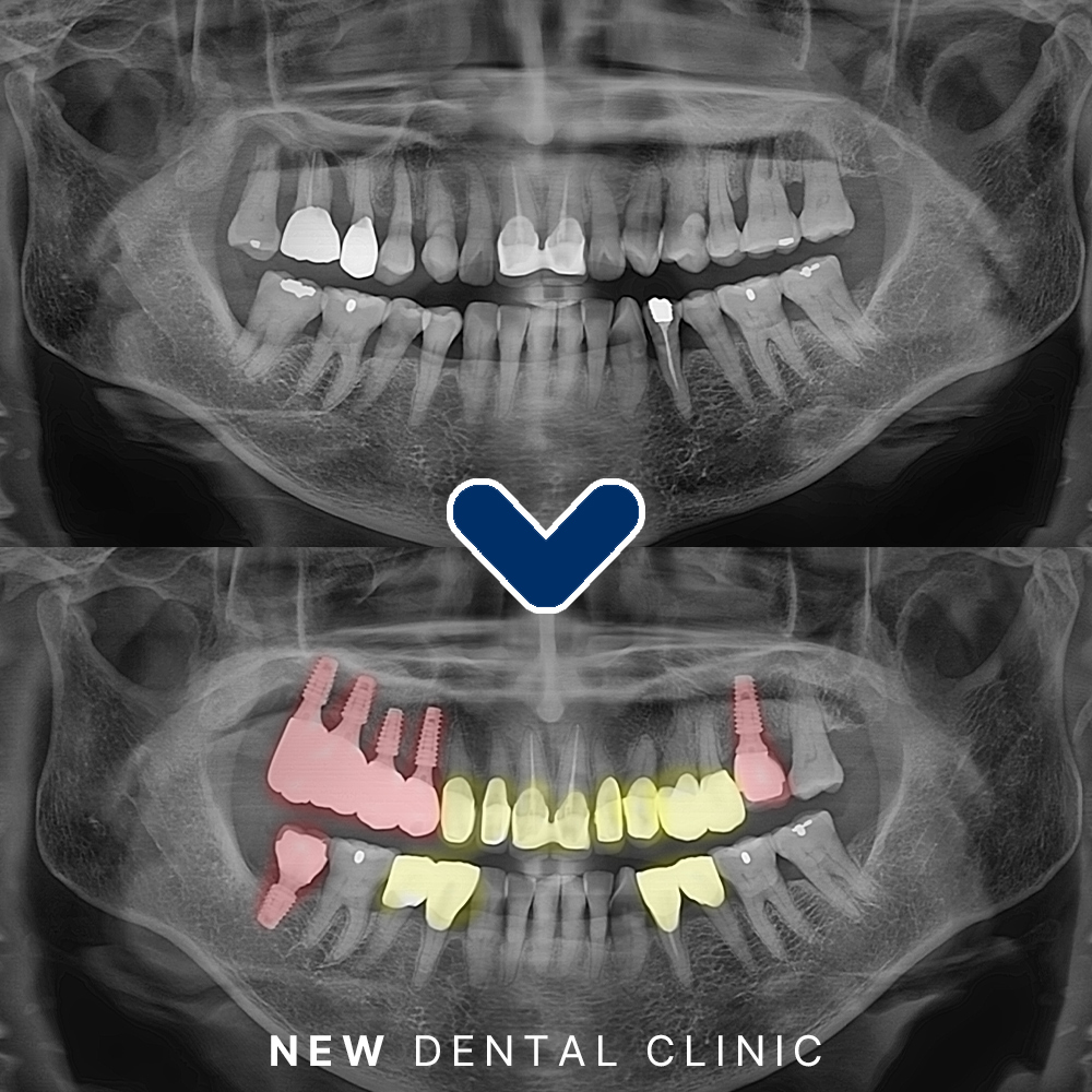 전반적인 치주 치료를 진행하여 재평가한 후, 어금니 부위 임플란트 식립과 앞니 크라운, 레진치료와 작은 어금니들의 크라운도 결정하여 진행하였습니다.