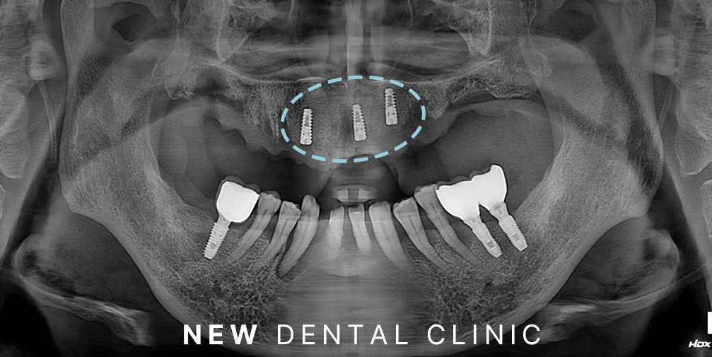 위턱 앞니의 경우 이미 존재했던 자연치가 빠진 후 잇몸뼈가 어느 정도 치유가 완료된 상황이었기에 바로 수술을 시작해도 무리가 없었습니다. 위 사진은 빠져버린 위턱 앞니 6개 치아를 대신하기 위하여 총 3개의 임플란트 인공치근(픽스처)을 심은 과정을 촬영한 사진입니다.