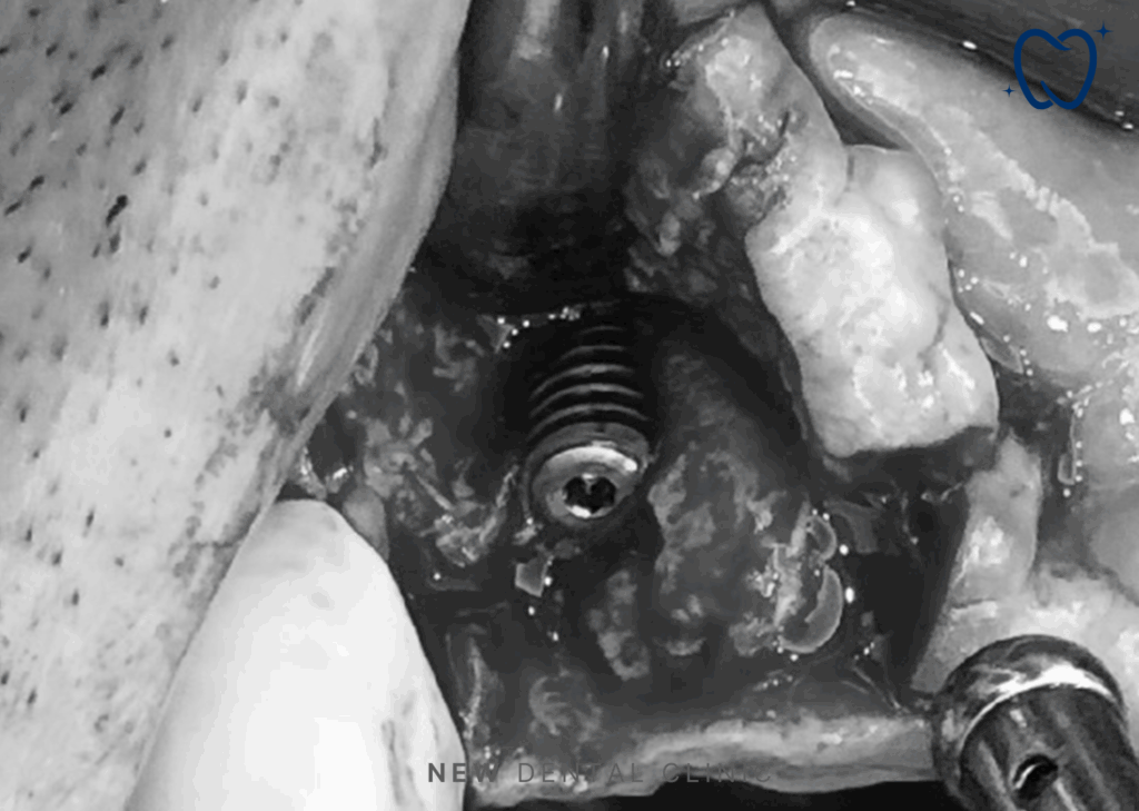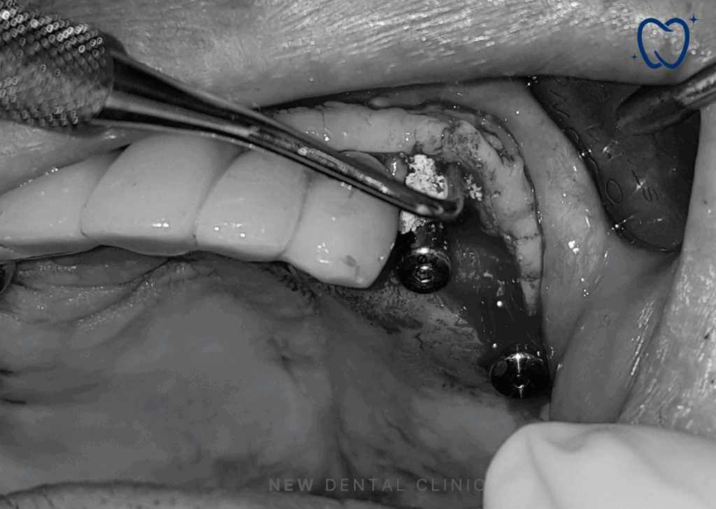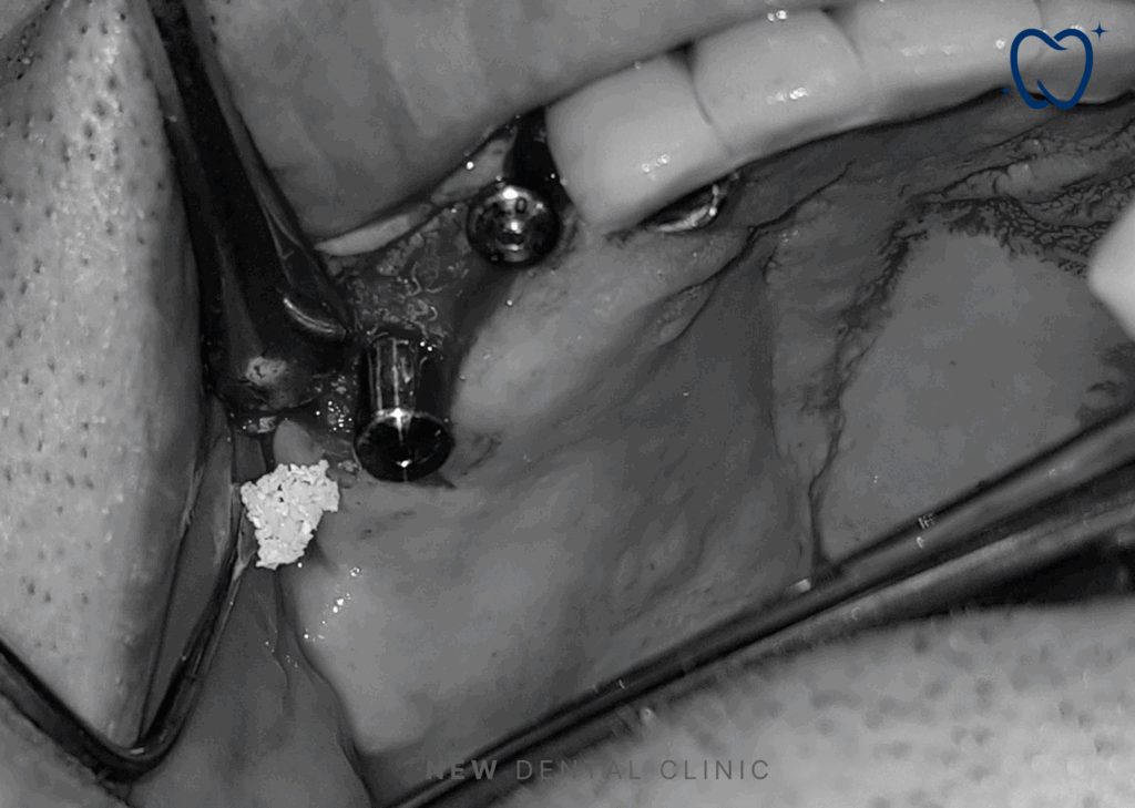 이후 아래턱 앞니의 수술을 시작했습니다. 해당 부분은 이미 자연치가 상실되어 있던 위턱과 달리 치아가 남아있는 상태였는데요. 치주질환으로 인한 염증으로 앞니 주변 잇몸뼈의 일부가 손상되었지만 이를 빼고 바로 픽스처를 심는 데에는 문제가 없었기 때문에 발치 후 즉시 임플란트 방식으로 수술을 진행했습니다.