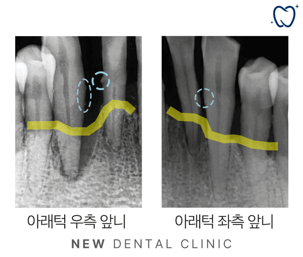 육안 검진과 엑스레이 촬영 결과를 종합해 보았을 때 심한 잇몸 염증으로 인해 잇몸뼈가 정상적인 높이에 한참 못 미치는 상태였으며, 그로 인하여 잇몸뼈가 남아있는 자연치를 제대로 잡아주지 못해 치아의 흔들림과 함께 원래의 위치에 있지 못한 채 뻐드러지는 등의 변화도 발생한 상황이었습니다.